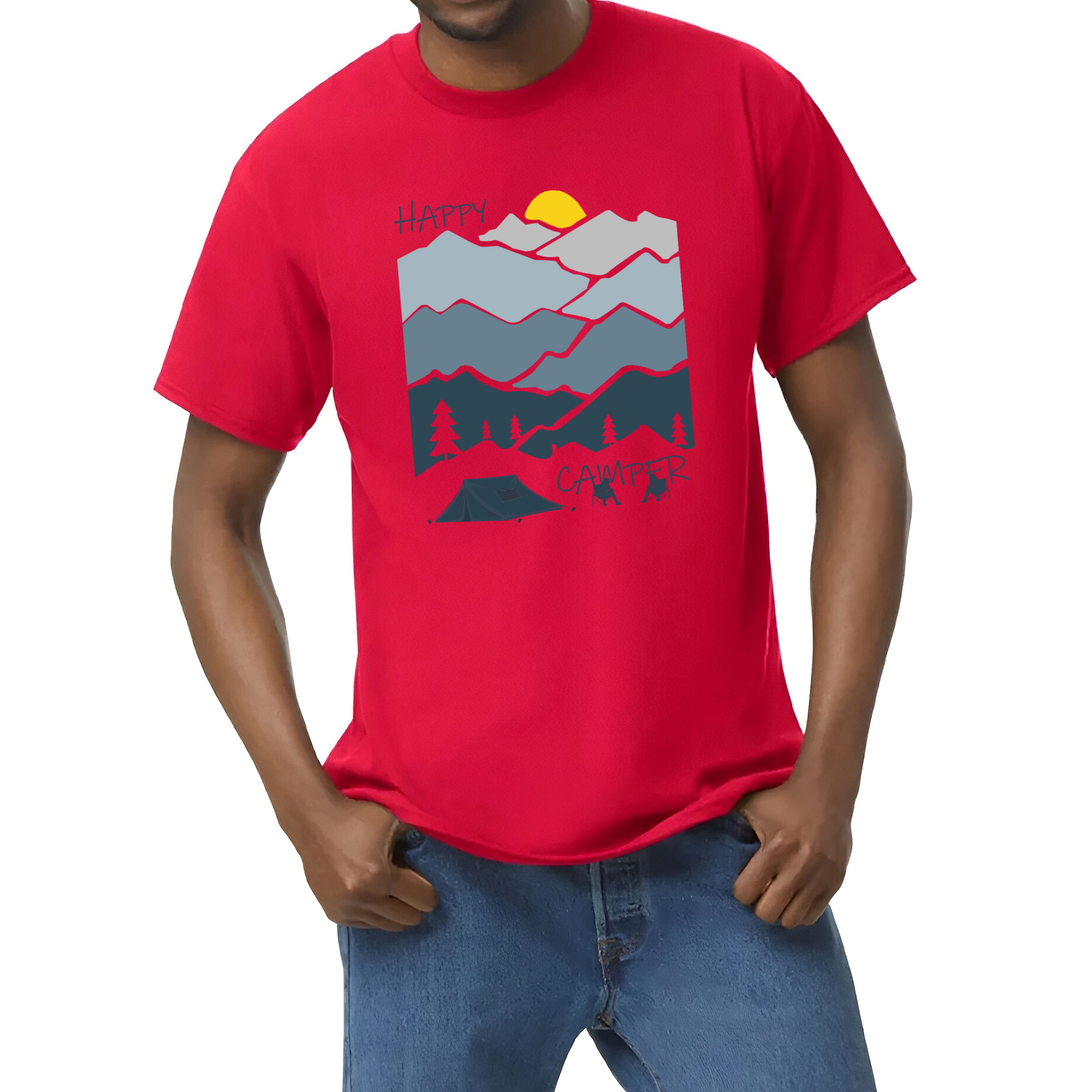 Bold Design: A cheerful mountain scene with sunrise, trees, a tent, and the phrase “Happy Camper” — capturing the joy of outdoor living and peaceful escapes.