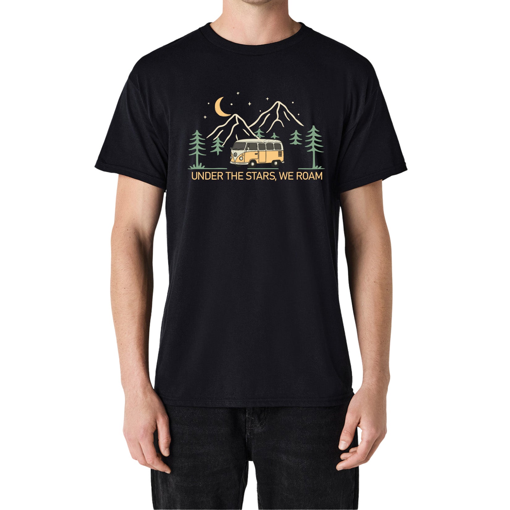 Bold Design: A dreamy nightscape with mountains, pine trees, and a van under the stars - paired with the phrase “Under the Stars, We Roam” to capture the freedom of life on the road.