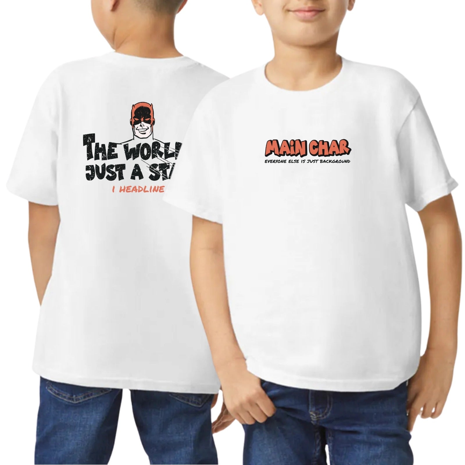 This bold tee features "MAIN CHAR" up front and a retro comic hero on the back with the quote: "The world’s just a story, I headline." Fun, confident, and perfect for standout personalities.. The design is printed using high-quality DTF (Direct-to-Film) technology, delivering vibrant colors and sharp details that last.